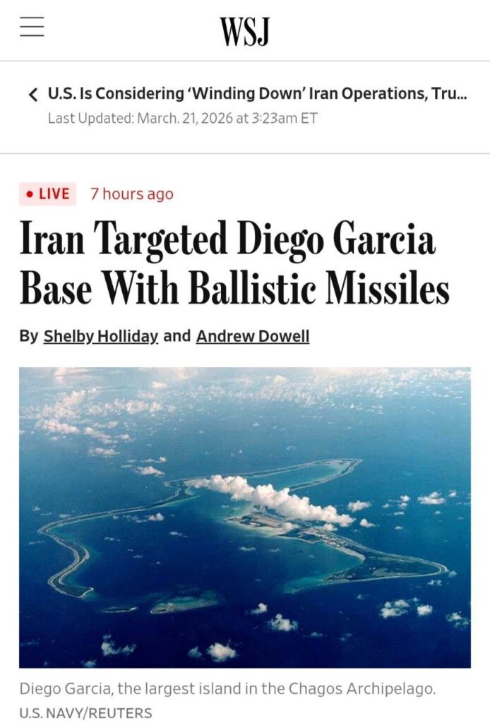 The Wall Street Journal published an article about this news, which is unpleasant for Trump. According to the report, Iran attacked a base on the island of Diego Garcia (in the Indian Ocean). Two long range missiles were launched, one fell short of its target, and the second was shot down by an American destroyer guarding the sea.